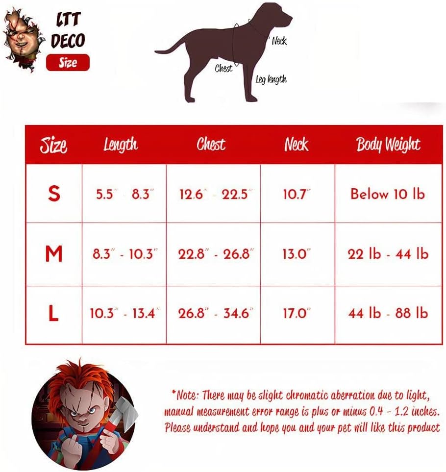 زي هالوين للكلاب الأليفة: يحاكي الزي شخصية تشاكي، مما يجعل حيواناتك الأليفة مخيفة ومضحكة، لطيفة، ومليئة بأجواء الهالوين.